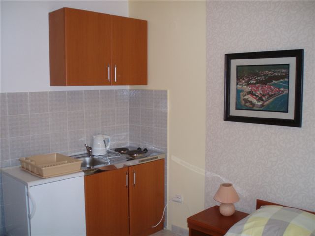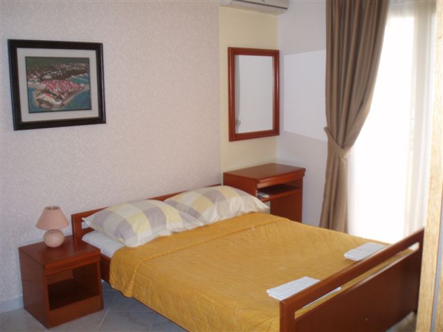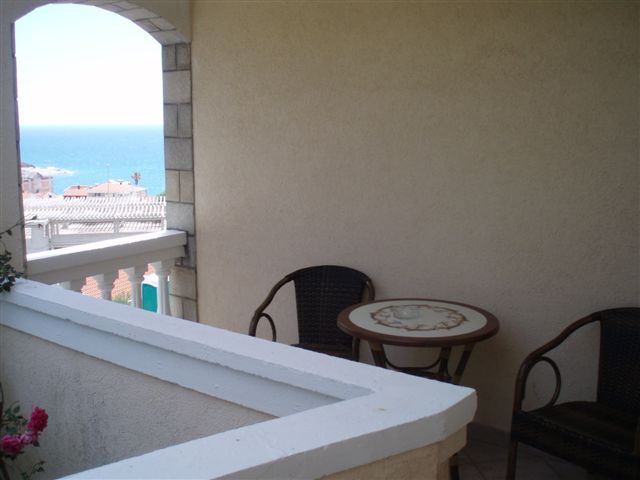Dvokrevetni studio posjedjuje kupatilo, mini kuhinju, bračni ležaj, balkon sa garniturom i bočnim pogledom na more.